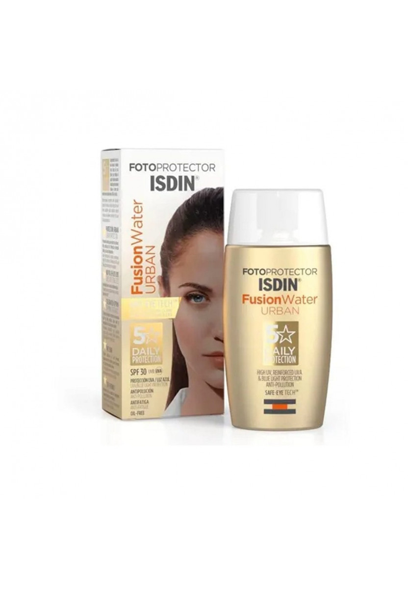 El fotoprotector facial Isdin Fusion Water Urban SPF 30, es ultraligera y de uso diario para entornos urbanos. Protege la piel del daño oxidativo inducido por la polución urbana y ofrece una protección reforzada frente a UVA y Luz Azul.